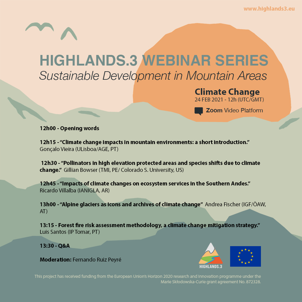 No âmbito do projeto Highlands, cujo objetivo reside na identificação de estratégias de desenvolvimento sustentável para territórios de montanha, no qual participam 42 instituições de todo o mundo, iremos dinamizar o Ciclo de Webinars dedicado ao tema geral deste projeto com financiamento europeu. O primeiro decorre no próximo dia 11 de dezembro, assinalando a efeméride do Dia Internacional das Montanhas, constituindo uma oportunidade para conhecer melhor a realidade destes territórios e o seu potencial de desenvolvimento, este ano dedicado à sua biodiversidade.