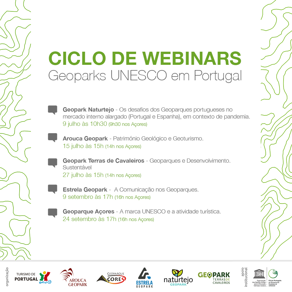 Os Geoparks Mundiais da UNESCO em Portugal, em parceria com o Turismo de Portugal, organizam o Ciclo de Webinars dedicados a esta importante classificação da UNESCO. Marque na sua agenda, assista aos 5 Webinars e conheça melhor os Geoparks portugueses, verdadeiros territórios de ciência, educação e cultura!