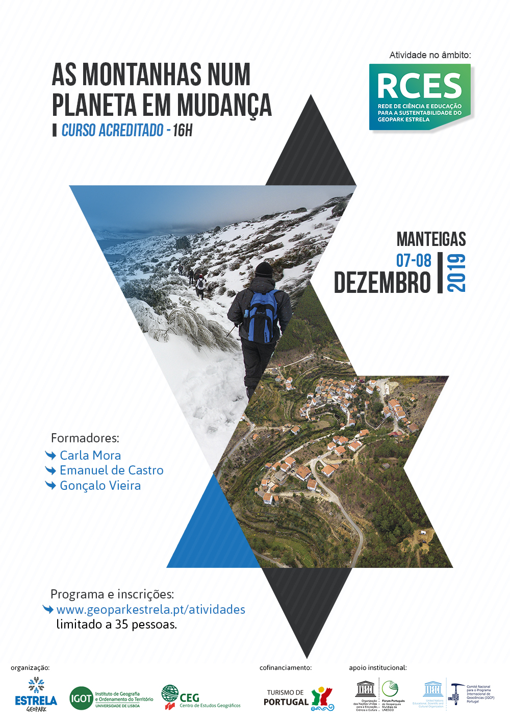 O Estrela Geopark promove nos próximos dias 7 e 8 de dezembro de 2019, o curso acreditado "As Montanhas num Planeta em Mudança", com a colaboração de Carla Mora, Emanuel de Castro e Gonçalo Vieira. O curso terá lugar no Ninho de Empresas de Manteigas.