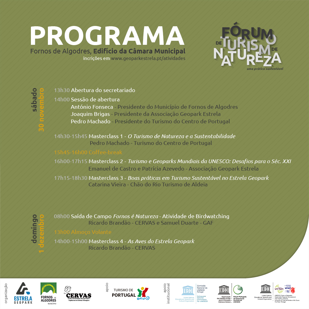 O Turismo é um dos pilares de um Geopark Mundial da UNESCO. Neste sentido, o Estrela Geopark em parceria com o Município de Fornos de Algodres e o CERVAS dinamiza nos próximos dias 30 de novembro e 1 de dezembro o I Fórum de “Turismo de Natureza – uma prática sustentável”, com o objetivo de debater, partilhar e encontrar estratégias para trabalhar o turismo de natureza de forma sustentável em territórios classificados como Geopark Mundial da UNESCO. Esta é uma oportunidade para debater o futuro do turismo da Estrela, perspetivando novas abordagens e novos produtos turísticos, sustentados e geradores de valor acrescentado.