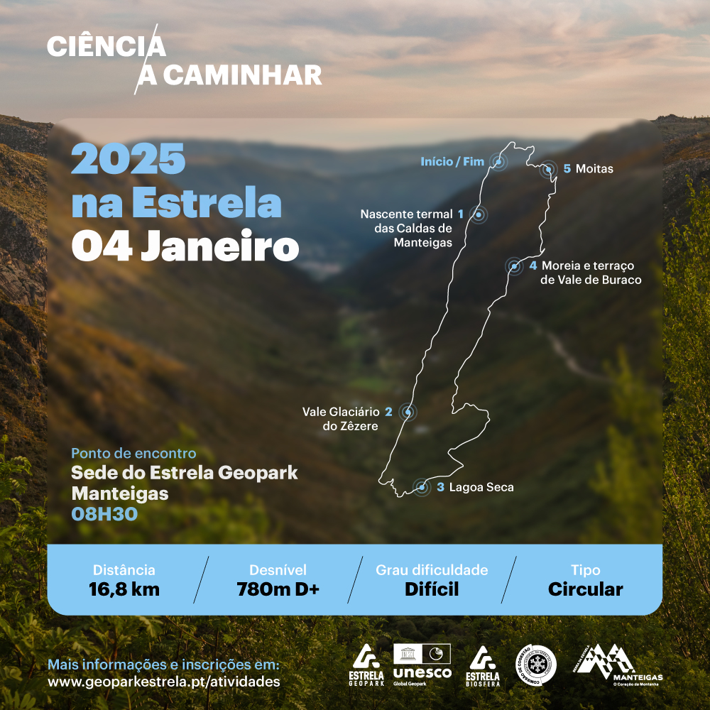 Em 2025, o Estrela Geopark Mundial da UNESCO dinamiza mais uma atividade em prol do conhecimento do território. Mais do que uma caminhada, este pretende ser um evento que coloca a ciência ao serviço das populações e dos mais interessados. Para começar o ano novo, 2025 na Estrela será a primeira caminhada interpretada.