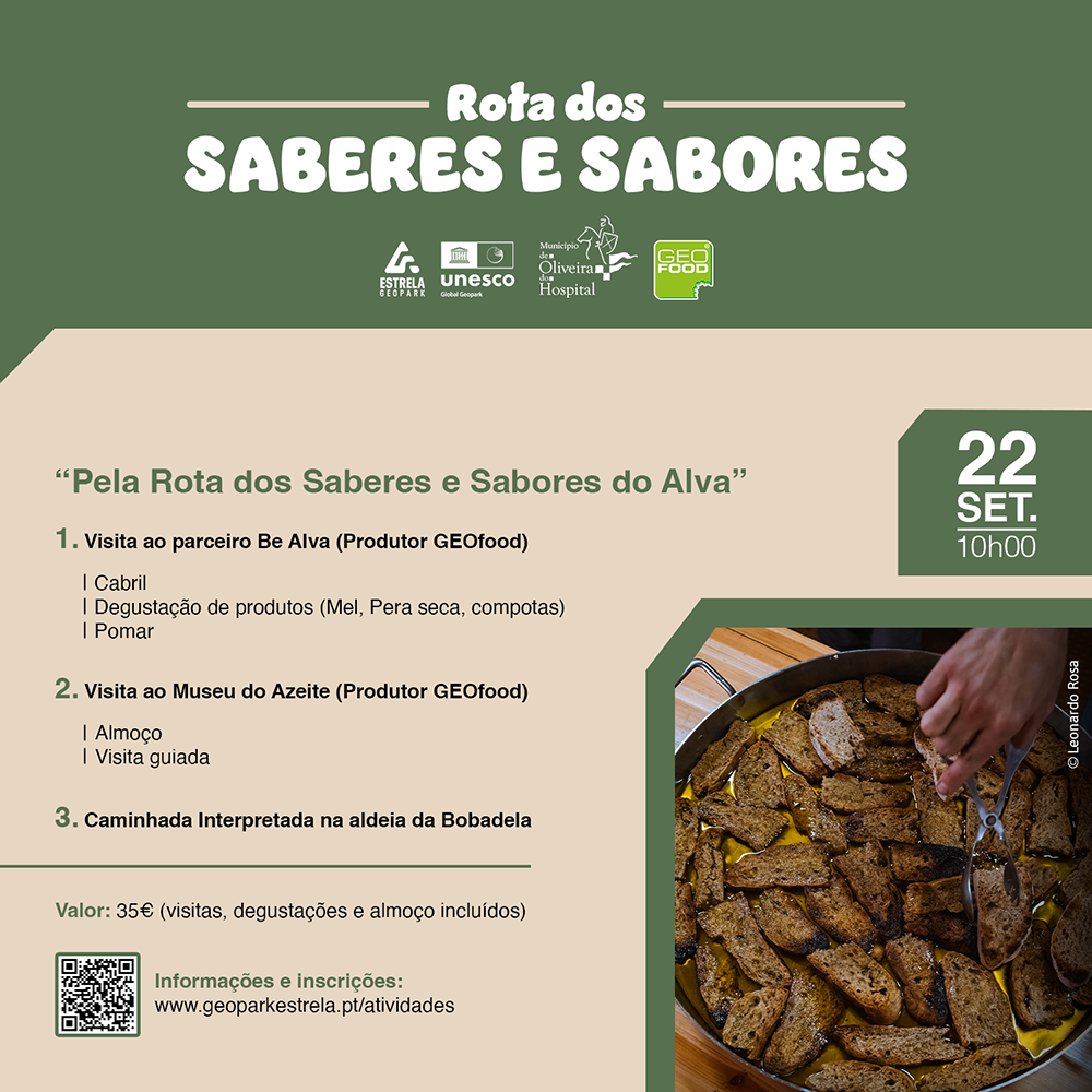 A Rota dos Saberes e Sabores do Estrela Geopark é uma viagem pela identidade deste território, pelos rostos que dão vida às memórias e pelas mãos, marcadas pelo tempo, que dão forma aos nossos produtos. No dia 22 de setembro, junta-te a Nós e vem conhecer os saberes e sabores do Alva, com visitas temáticas, degustações e almoço, numa parceria com os nossos produtores GEOfood! Esperamos por ti para conhecer melhor este Geopark Mundial da UNESCO!