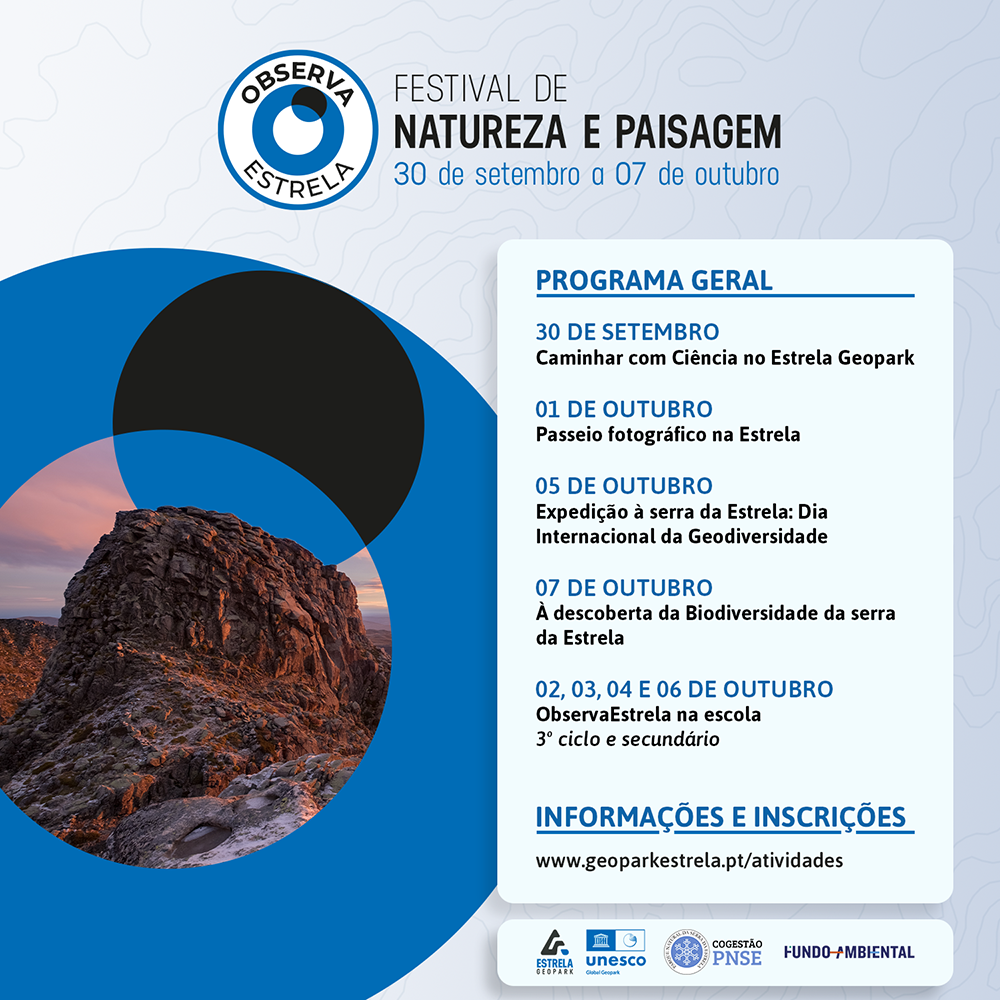Entre os dias 30 de setembro e 07 de outubro de 2023, o Estrela Geopark Mundial da UNESCO, promove a 4ª edição do festival ObservaEstrela. Este festival de Natureza e Paisagem tem por objetivo a promoção da ciência e o turismo de forma integrada, contribuindo para o maior conhecimento sobre os valores naturais e culturais da montanha mais alta de Portugal Continental. Ao longo dos vários dias do evento, são promovidas várias atividades outdoor temáticas, permitindo aos visitantes e locais descobrir e conhecer melhor o valor desta Montanha, bem como atividades escolares que contribuem para a formação e consciencialização das novas gerações.